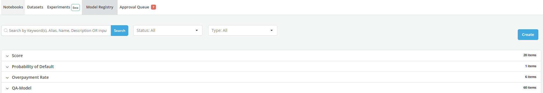 The Model registry allows Users to register models into the platform so that they can be used in downstream processes such as Policy writing and performance reporting. Any Model regardless of whether it was built within the platform using the Notebook or the Guided Flow (datasets and experiments) or outside the platform using external modeling tools can be registered for use within the platform
