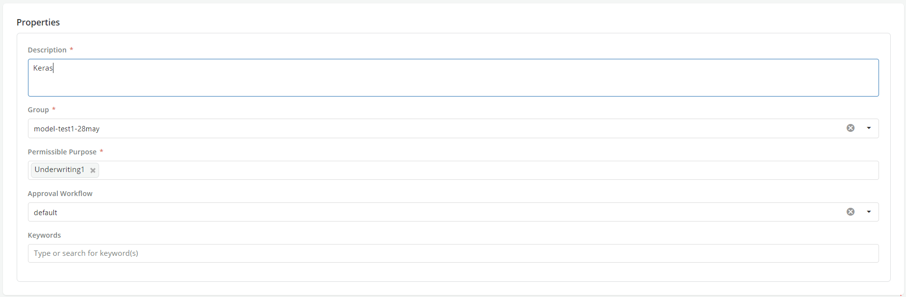 Permissible purpose:The purpose for which the model can be used (e.g., Underwriting or Prospecting). These permissible purposes will be tracked across the platform. If a model is registered and later on used for a purpose other than its permissible purpose(s) the lineage will display red flags.