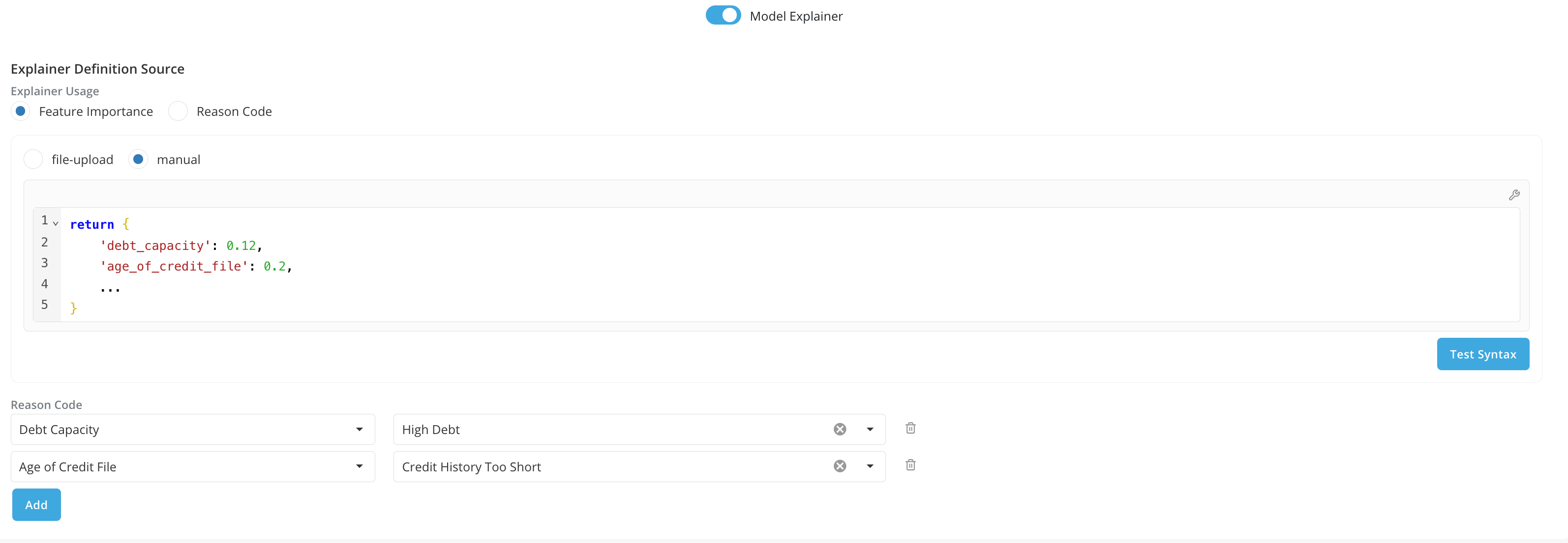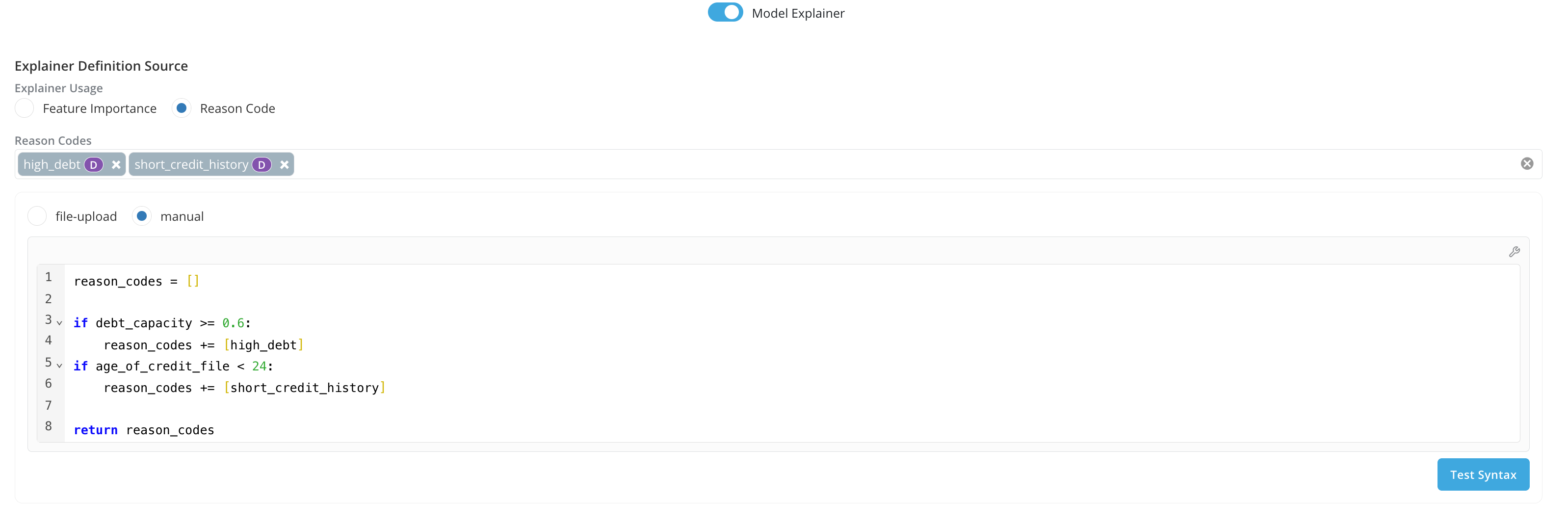 - Additionally, if Explainer Usage is Reason Code, users can select and access a list of registered Reason Codes.