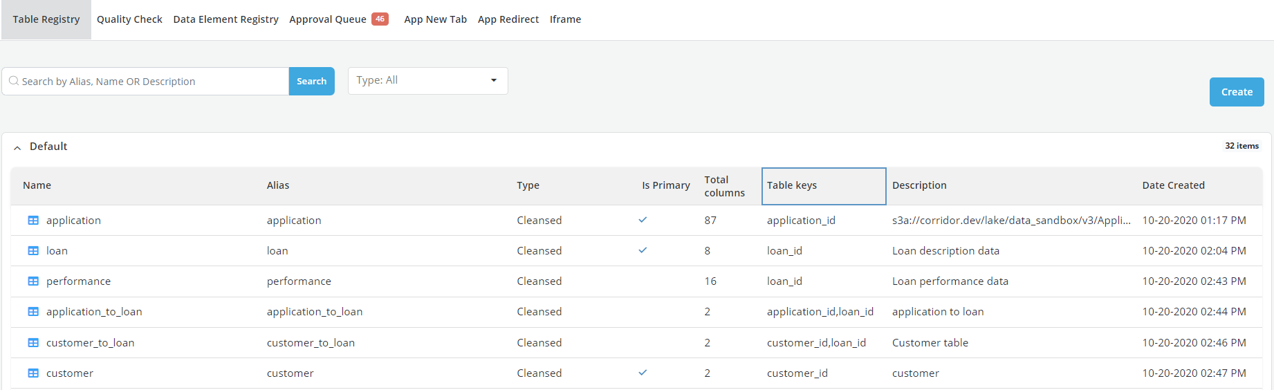 Table registry allows users to record on the platform the location, content and structure (i.e., keys) of the source data tables that would be used to run analytics on the platform.