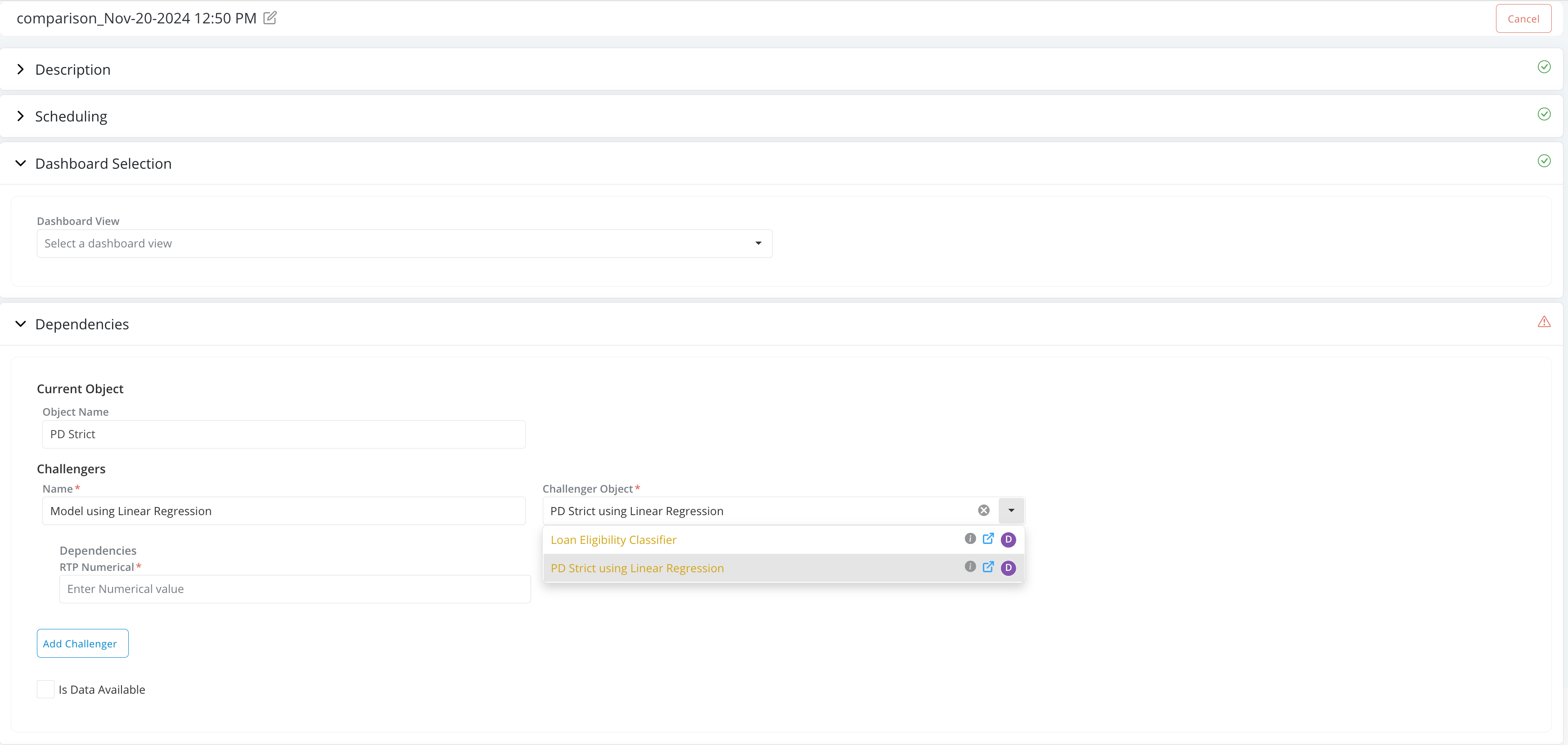 Challenger objects: Challenger objects are objects of same type (e.g., models can be compared with other models, data elements can be compared with other data elements, etc.). Challengers can be selected from a drop down list of object. Users can add as many challengers as they want to a comparison. To add a challenger just click on the "+" button on the right side of the input box.