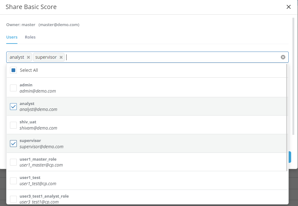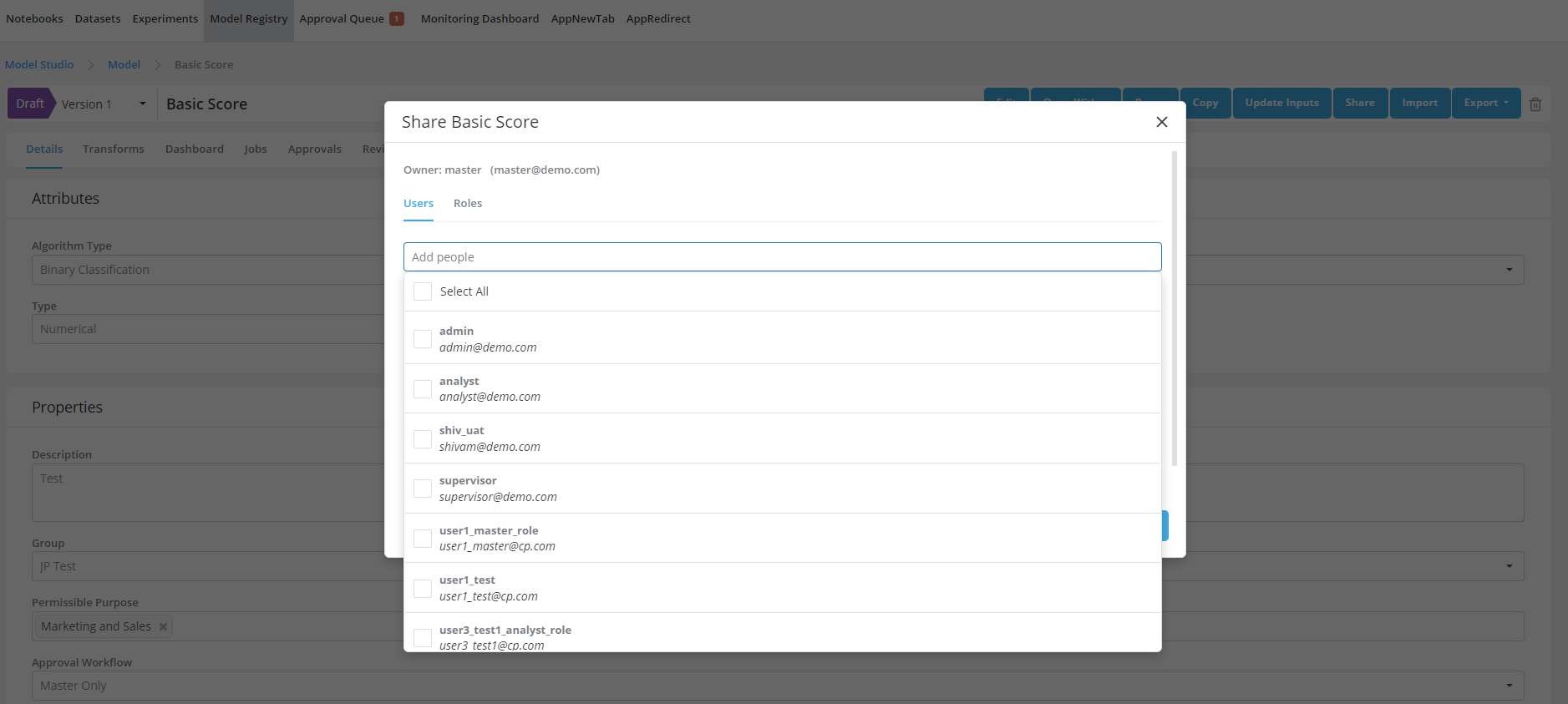 - The share capability operates on the following objects: Data Elements, Feature, Model, Policy, Datasets, Global Functions, Products and Frameworks.