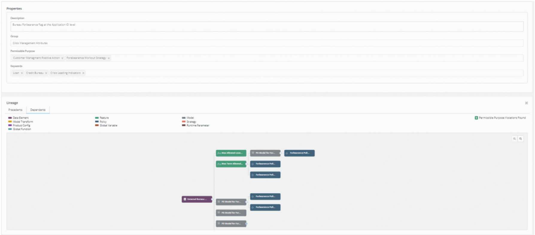 Authorized access to new data sources with controls: The Platform allow rapid incorporation of new data sources with the right level of controls for authorized use, while providing complete flexibility for modelers to leverage AI for innovation in risk modeling while enhancing governance and traceability. In the example below, the account level forbearance data from the bureau is registered and governed for permissible use in models for underwriting with full lineage traceability of use in downstream models.