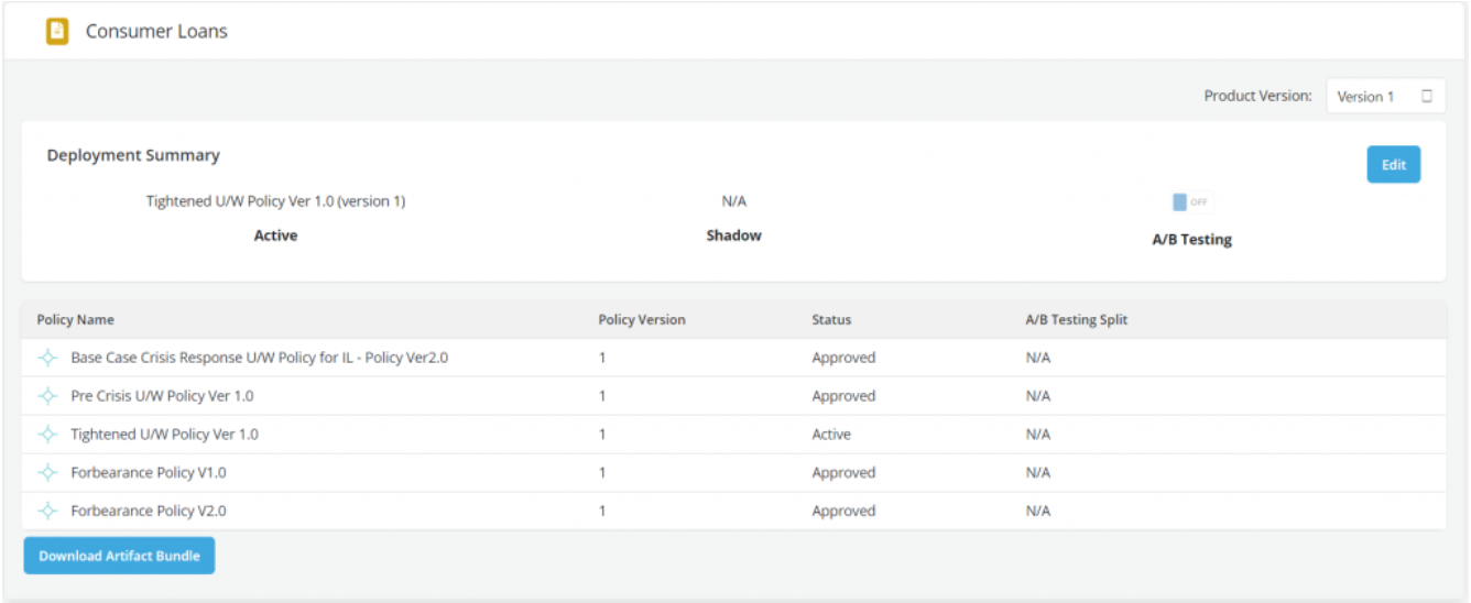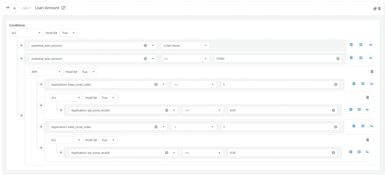 Rapidly develop and test new decision strategies using ‘English like’ rule writer: Platform supports rapid development of strategy overlay rules on model output using a strategy writer engine that is highly intuitive and easy for a policy writer to use. Strategy rules can be defined segment-wise or encompass all segments. In the example below, the score cutoff for default for high affected states by Covid-19 is tightened versus BAU, with an intuitive rule overlay on existing model scores.