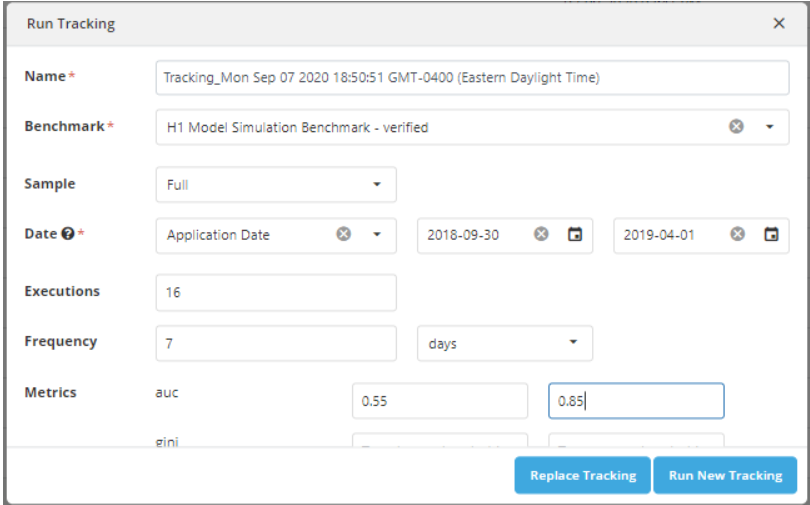 Automated model monitoring: Platform provides capabilities for banks to easily set up automated performance monitoring of models at pre-scheduled periods as well as define performance benchmark thresholds, which if breached, resulting in an exception trigger report to the model monitoring team. This automates the monitoring process and facilitates management by exception. In the example below 16 iterations for model tracking on a weekly basis is setup with floor and ceiling AUC (Area Under Curve) of 0.55 & 0.85 respectively.