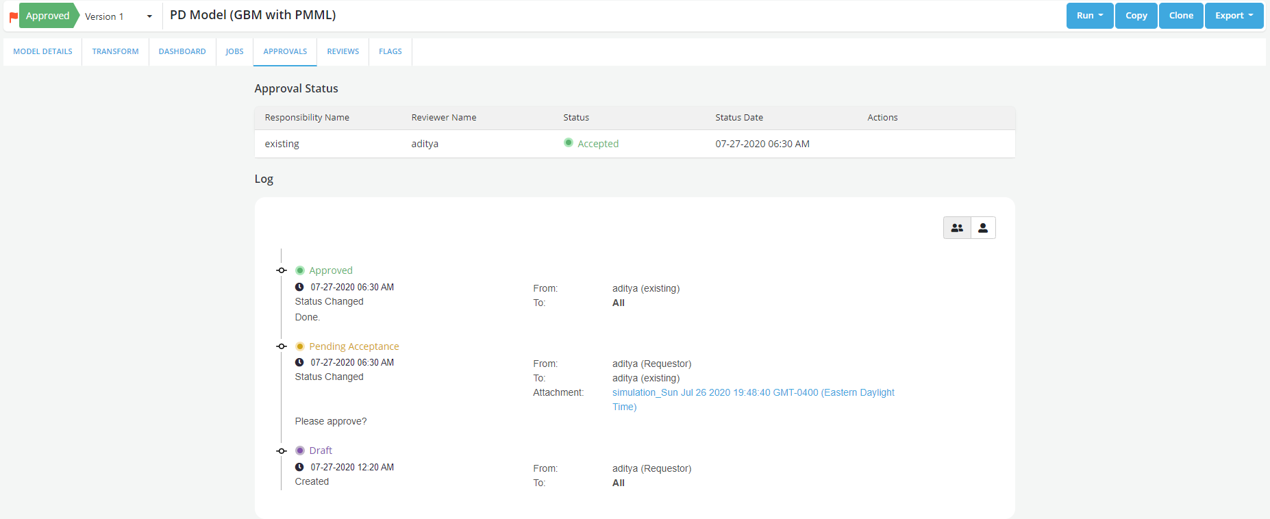 Model developer and reviewer can rapidly develop multiple scenarios for model validation (including extensive data segmentation), automate the development of standardized model performance metrics (ex: AUC curve, KS Tables etc.) and track the approval workflow process including multiple approval levels & audit trails through the platform. In the example below, the segmented validation for low FICO applicant base is lower than the benchmark and suggests that the modeler might need to put in some business rule overlays to address the issue. In addition, the following image shows the approval workflows audit engine which supports layered approvals with audit trails.