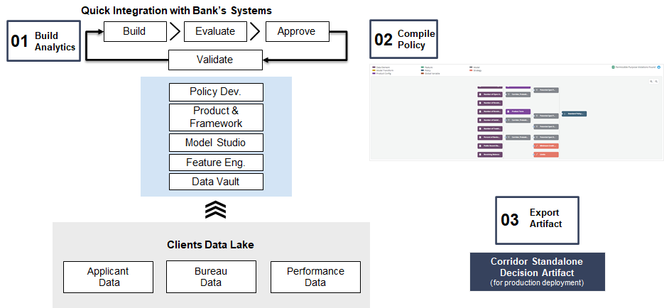 Once the analytics is built and approved’ custom approval workflows on the Corridor Platform stitches together a standalone artifact which incorporates all the dependent models, features and data elements required to enable the analytics for the prospecting policy.