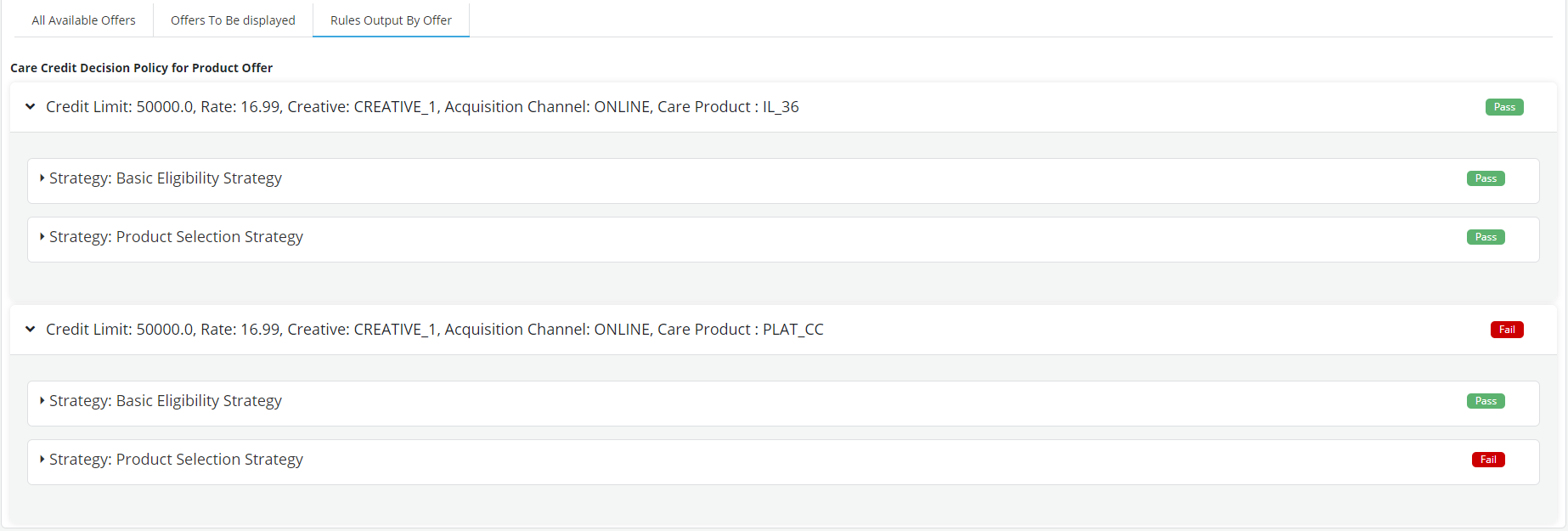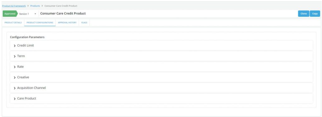 Corridor has flexible capability to set up product types (or categories) such as credit cards, installment loans with configuration parameters defining the product type. Then, specific products can be instantiated from the product type. In the example below, ‘36month installment loan’ and a ‘platinum credit card’ are instantiated as the two potential products to be offered to prospects.