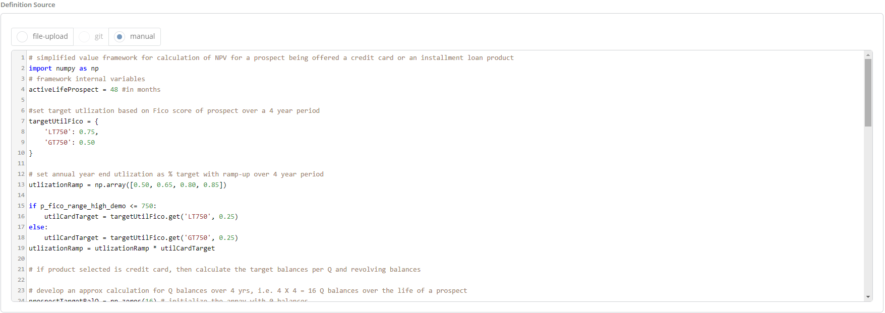 The policy writer can set up a sophisticated custom framework to calculate LTV of prospects. The framework takes a set of inputs (described below), a custom logic for calculation of LTV and outputs the estimated discounted cash flows which are then used in the valuation function to calculate the LTV for each offer configuration.