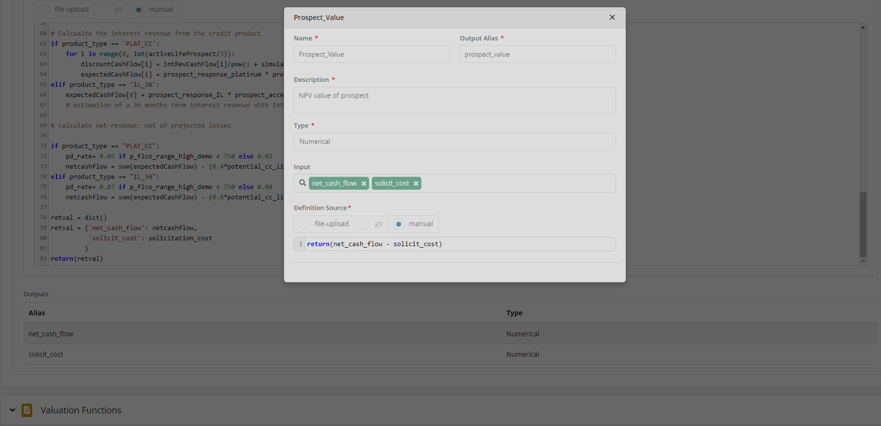 The framework logic outputs the estimated discounted cash flows of the prospect which are then used to calculate the LTV of the prospect through the Valuation Function. See screenshots below.