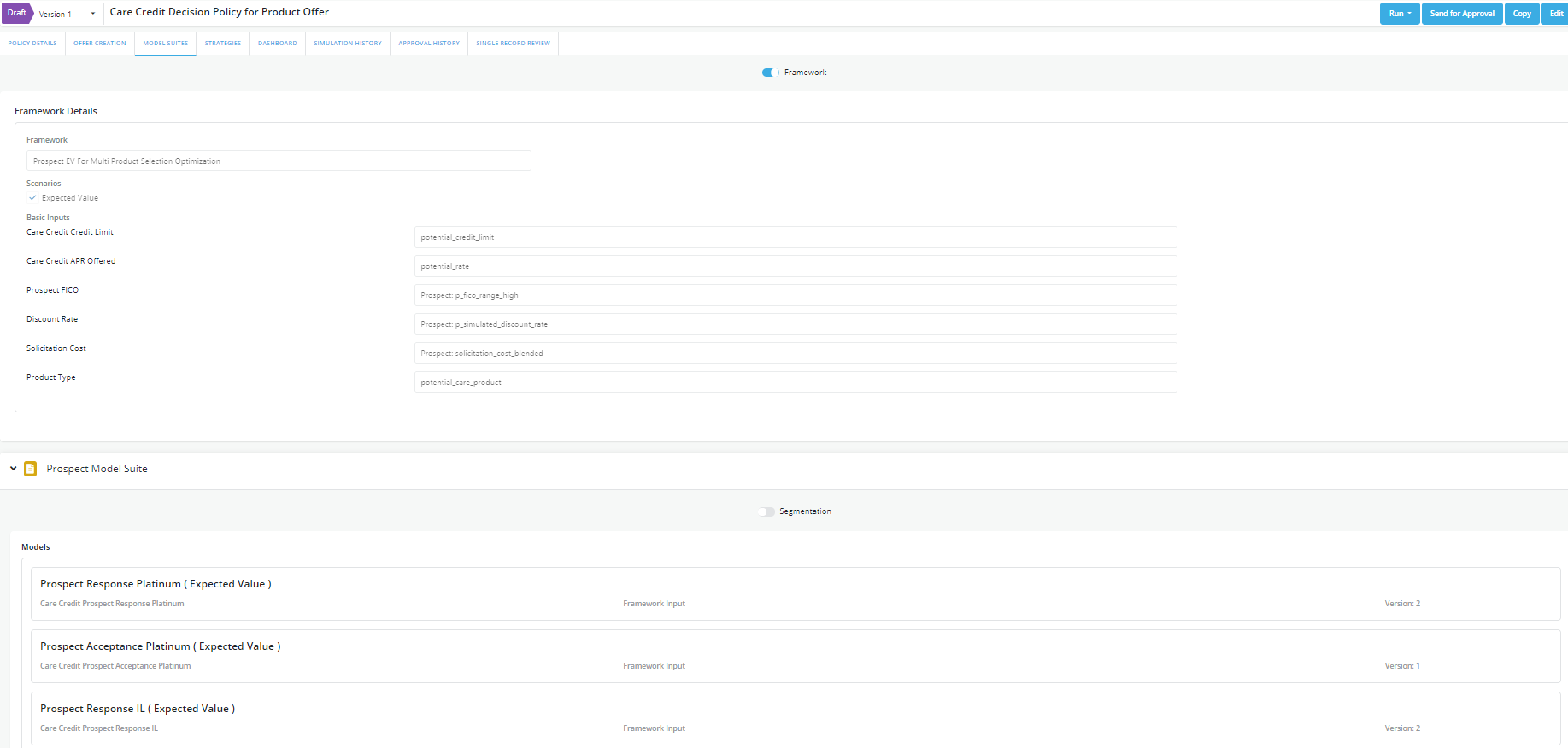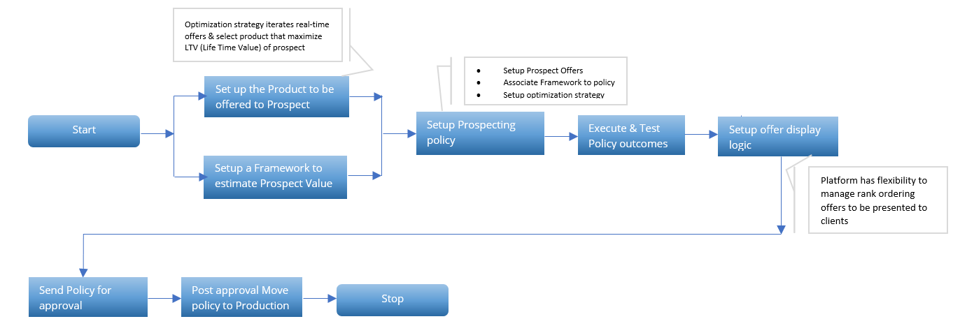Prospecting policy setup: As the first step, register the prospecting policy through the Prospecting module and set up the offer generator, the prospect LTV framework and models to be used for defining the optimization strategy.
