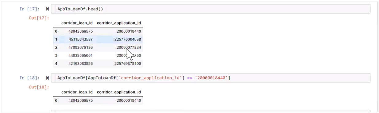 Application_to_loan table. In the screenshot you can see corridor application_id and corridor_loan_ID mapped to system keys application_id and loan_id which are set up during registration of primary tables. This is required to establish a relationship between application and loan table. These system keys are unique but not primary.