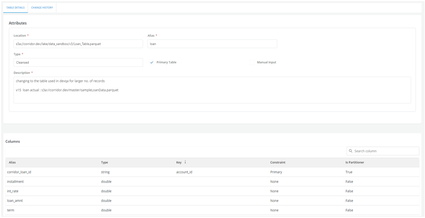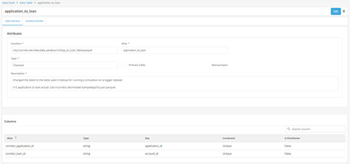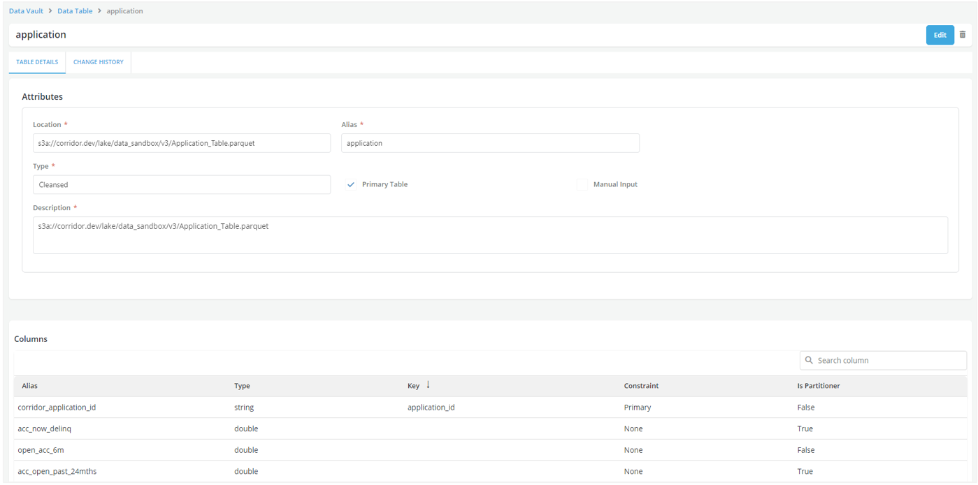 The screenshot below shows the detailed form to register an Application table. The application_id which is the system key is mapped to the corridor_application_id. This is marked as a Primary key as a Constraint. In the screenshot you can see other data elements being pulled which is essentially the bureau data at the application level.