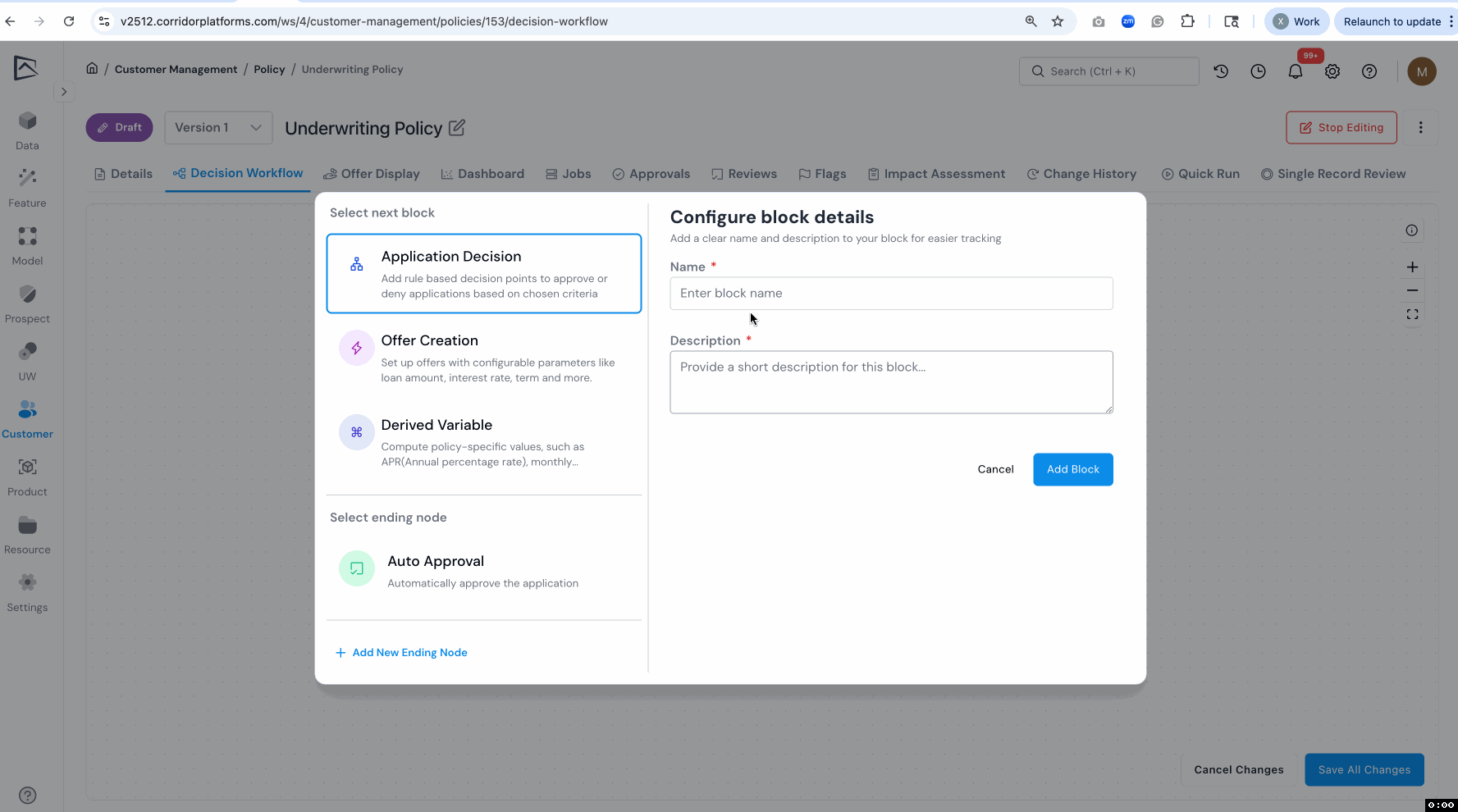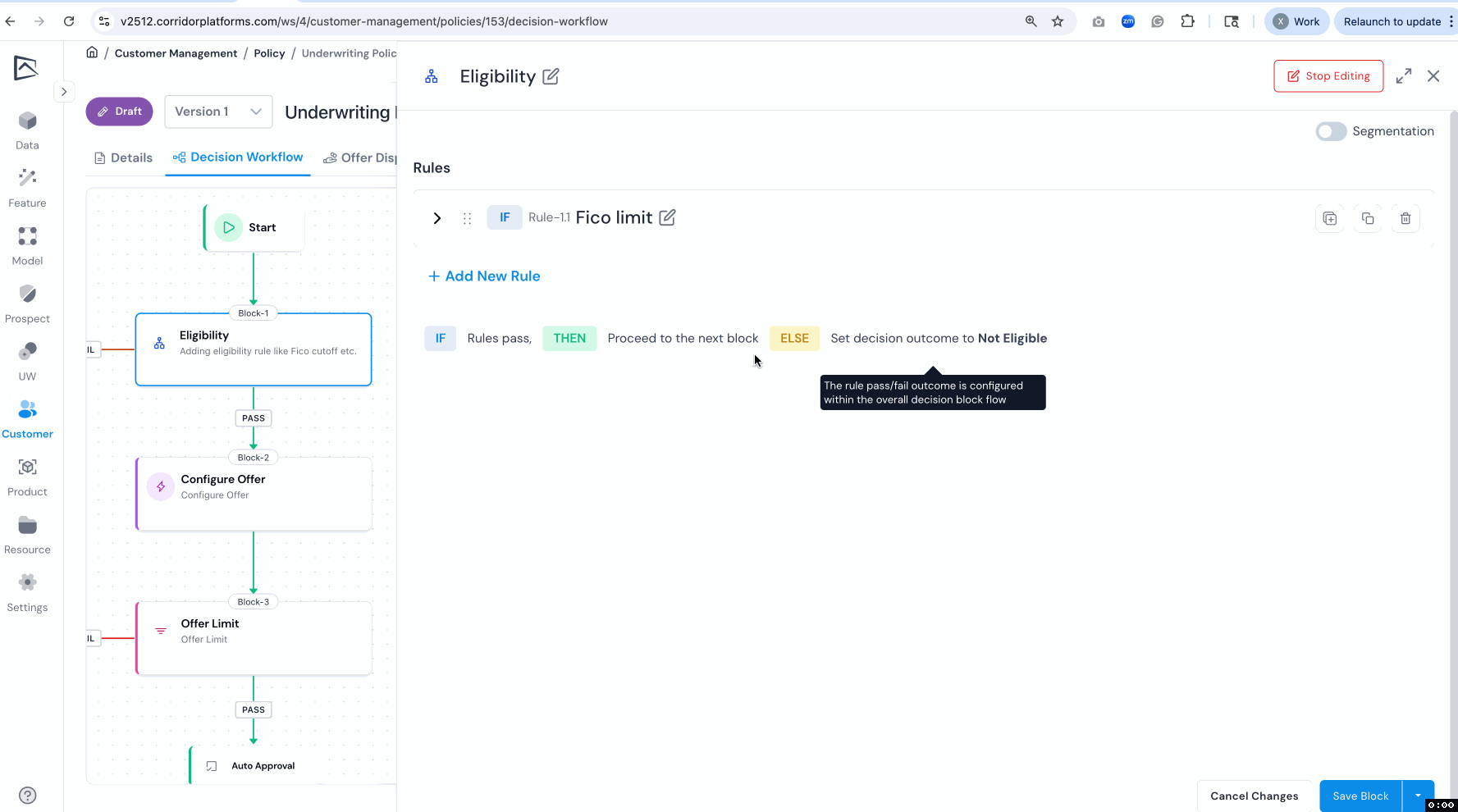- Block-Based Decision Flow Design lets you build your policy using modular blocks like Application Decision, Offer Creation and Offer Filtering. For each block, you can configure the outcome paths, for instance, if the block passes, the application continues to the next block; if it fails, you can auto-deny, send to manual review, or approve based on your business logic.
