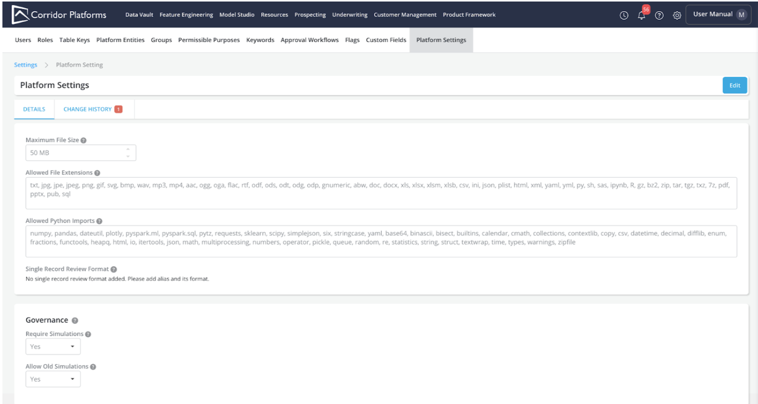 A new page in “Settings” has been added called “Platform Settings” which allows quick access for administrators to configure various aspects of the platform. These parameters were earlier available in the api_config.py file on the server. And frequently required a Request For Change (RFC) process to make changes to them, and hence were affected by infrastructure freezes at an organization level. Now that they are available on the Settings page - they can be changed on the fly, and also have a clear Change History on what was changed, when it was changed, and who changed it.