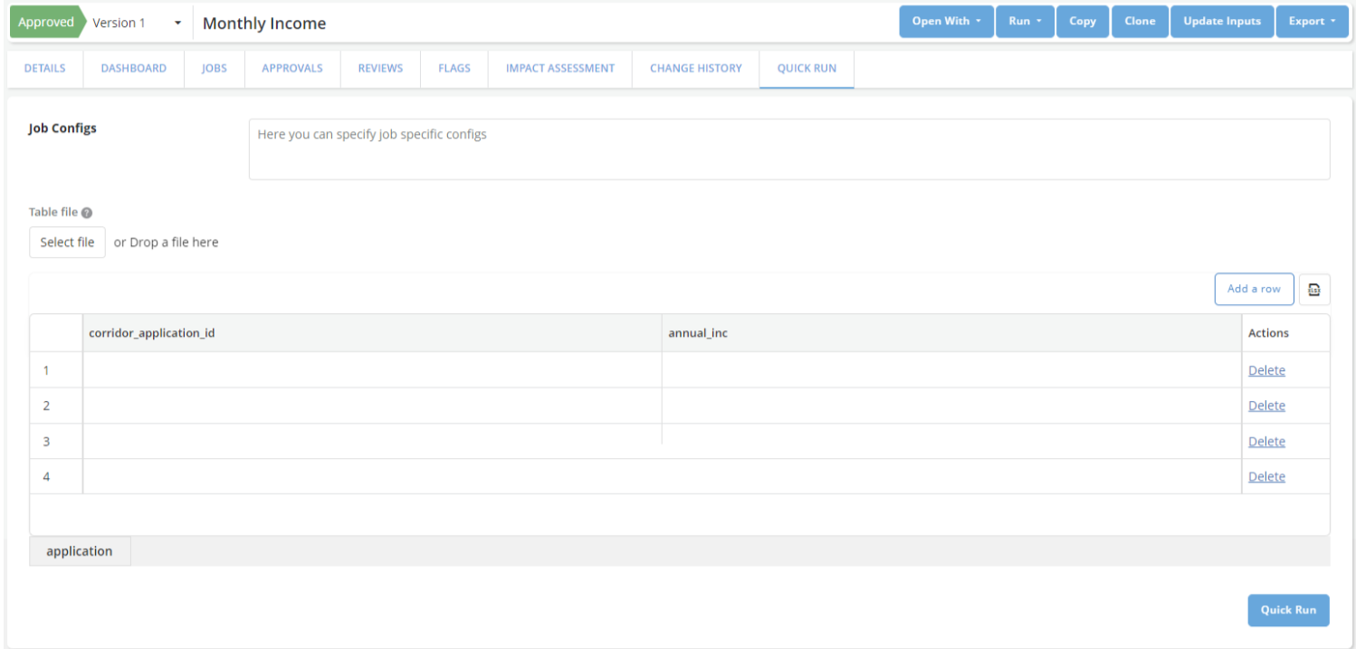 When registering data elements, features, or models - it is crucial to test that the registered logic is providing the results that were expected. Corridor has Job types like Simulation, Validation, and Verification that can help in running the logic on historical datasets to compare results for millions of records. But often it is easier to validate the logic on small datasets and not rely on your Big Data cluster. To achieve this, we have created the option to perform a “Quick Run”, in which the definition of objects can run on small data without needing to be queued for execution on the cluster. These quick runs have a time limit of ~5 minutes (which is configurable) and cannot be used on large data.