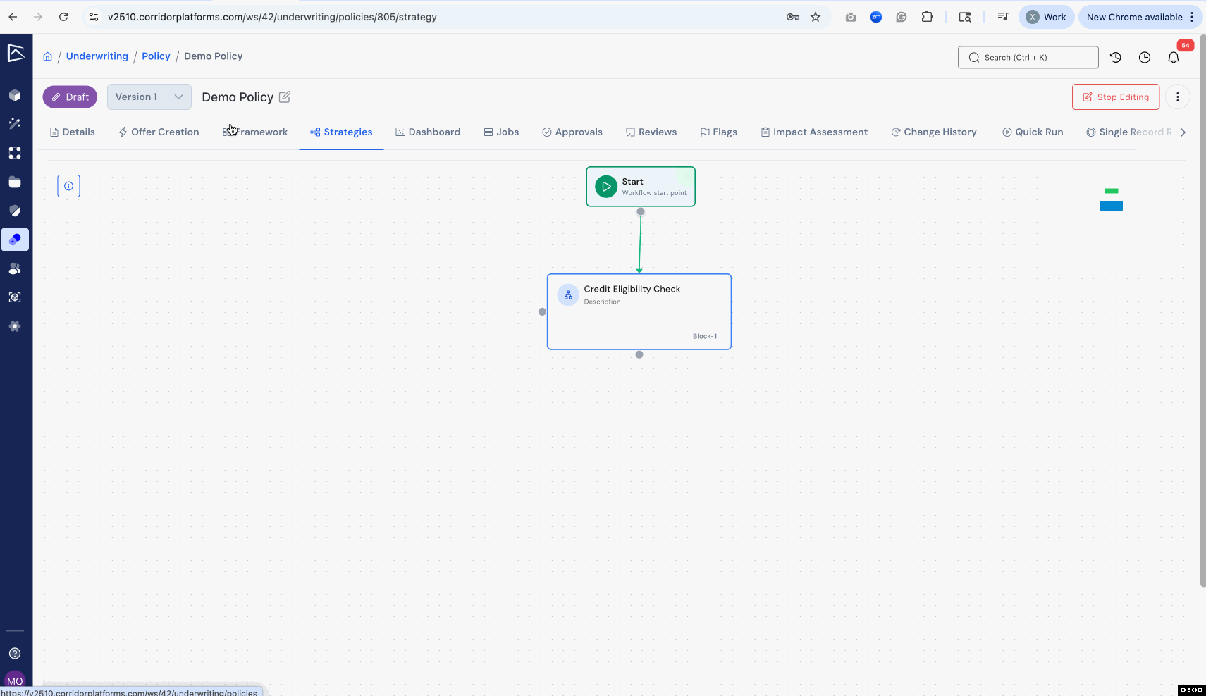 We’ve added a new visual canvas that lets policy writers design end-to-end decision flows by placing and linking decision blocks (Application Decision, Offer Filtering, etc.). Each block exposes configurable pass/fail outcomes so writers can map high-level policy structure first, then open any block to author the detailed rules that drive the decision.