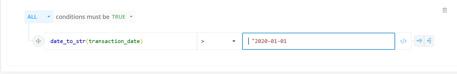 you can now utilize basic expressions in the conditions, such as: end_date \<= month + 1, to streamline and refine your data processing. This improvement is designed to enhance your data management processes, providing greater control and operational efficiency.