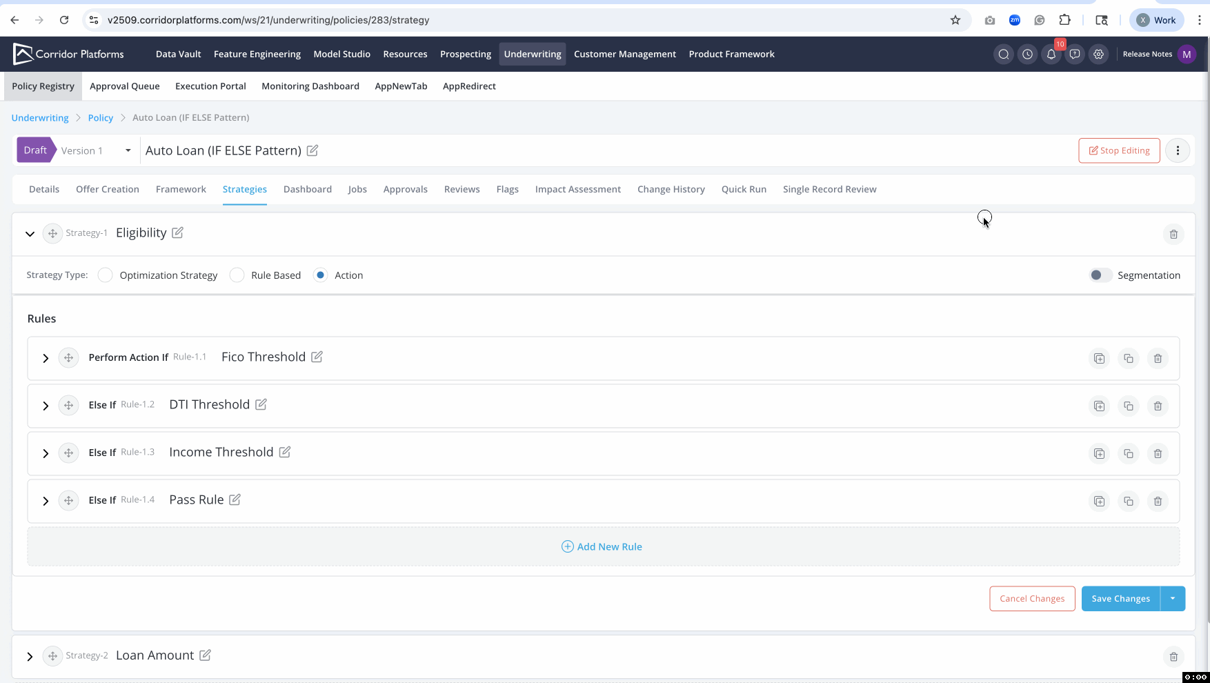 - For action-based strategies, a helper message shows that an action is assigned if any rule passes.